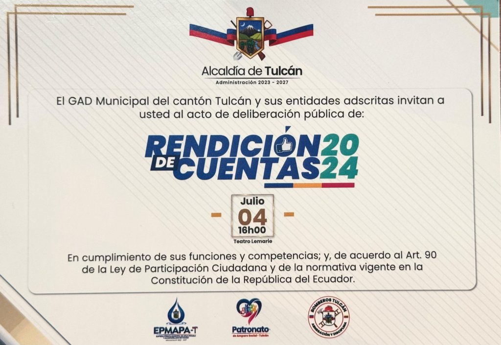Rendición de Cuentas 2024, invitan cordialmente a la ciudadanía a participar en el acto de deliberación pública, un espacio para compartir resultados, recibir aportes y seguir construyendo un Tulcán más justo y participativo.
